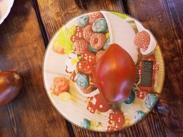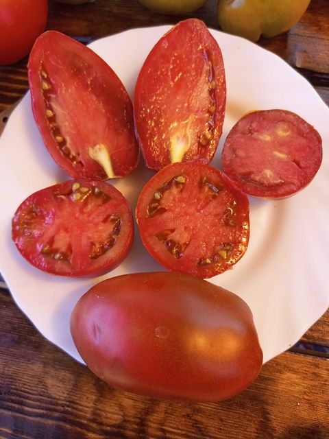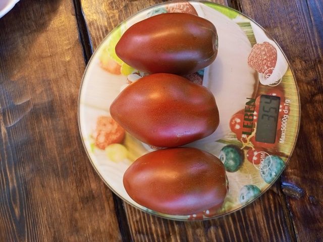 Среднерослый, в ОГ был около 1,3 метра, среднеспелый сорт. Плоды вытянутые сердечки, коричнево-красного цвета, с коричневатыми плечиками. Мясистые, вкус со сладостью. Вес 130-150 грамм. Сорт салатный, а также хороши для цельноплодного консервирования. В упаковке 10 штук.
