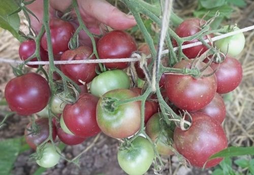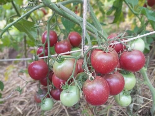 Высокорослый (до 2х метров), среднеранний сорт с очень большой кистью. Плоды округлые, небольшого размера, 40-50 грамм, коричнево-фиолетовые, очень сочные, с тонкой кожицей. Вкус со сладостью. Лист картофельный. В упак. 10 шт.