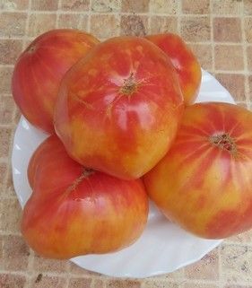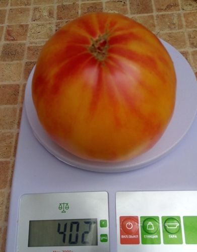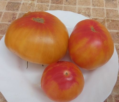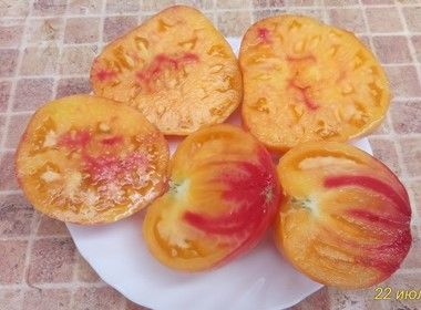 Высокорослый, среднеспелый сорт. Плоды биколоры, оранжевые с розовыми пятнами и полосами, на разрезе биколоры, оранжево-розовые. Мякоть сочная, сладкая, с фруктовым вкусом. Вес 200-400 гр., отдельные крупнее.