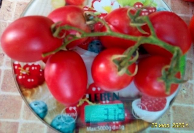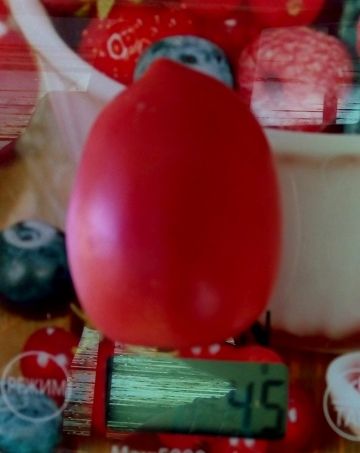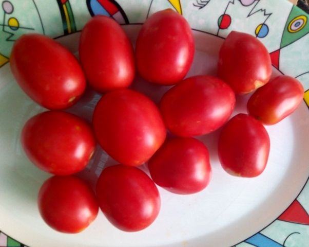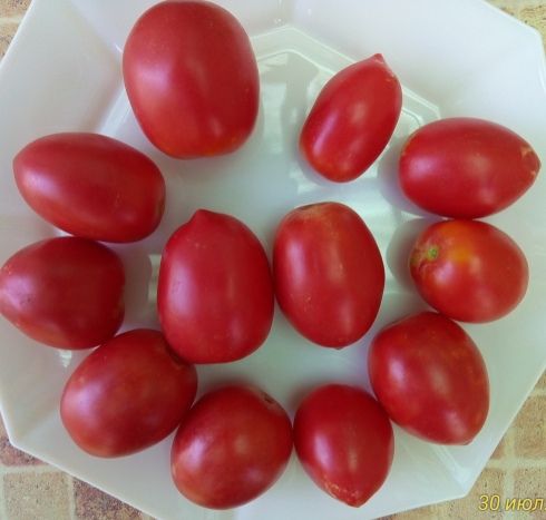 Скороспелый (87-95 дней) сорт для защищенного грунта. Растение полудетерминантное, высотой 1,2-1,4 м. Требует пасынкования и подвязки. Плоды удлиненно-сливовидные, красно-малиновые, массой 20-25 г, плотные, с повышенным содержанием сахаров и витаминов. Ценность сорта: обильное плодоношение, высокие вкусовые и технологические качества, транспортабельность. Рекомендуется для употребления в свежем виде и цельноплодного консервирования.