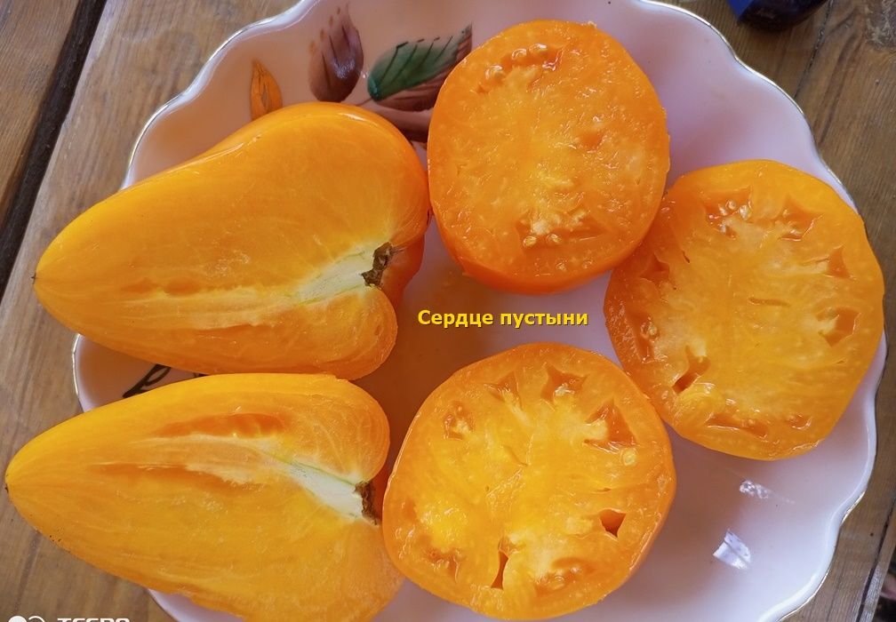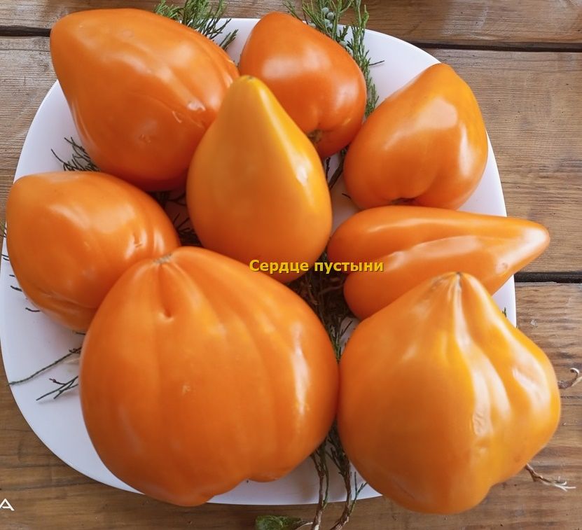 Индетерминантный, выскорослый, среднеспелый сорт. Куст крепкий, с сильными побегами и длительным периодом плодоношения. Плоды сердцевидные, с заостренной верхушкой, желто-оранжевого цвета, весом 200-500 грамм, плотные, почти без сока. Мякоть маслянистая, ароматная, сахаристая на изломе, со сладким вкусом. Отличный салатный сорт. В упак. 8 шт.