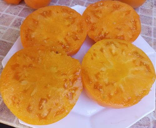 Индетерминантный, среднеспелый сорт. Плоды крупные, желто-оранжевые, плоскоокруглые, слегка ребристые. Мякоть плотная, зернистая, со сладостью, очень вкусная. Вес 300- 400 гр. Салатный сорт. В упак.10 шт.