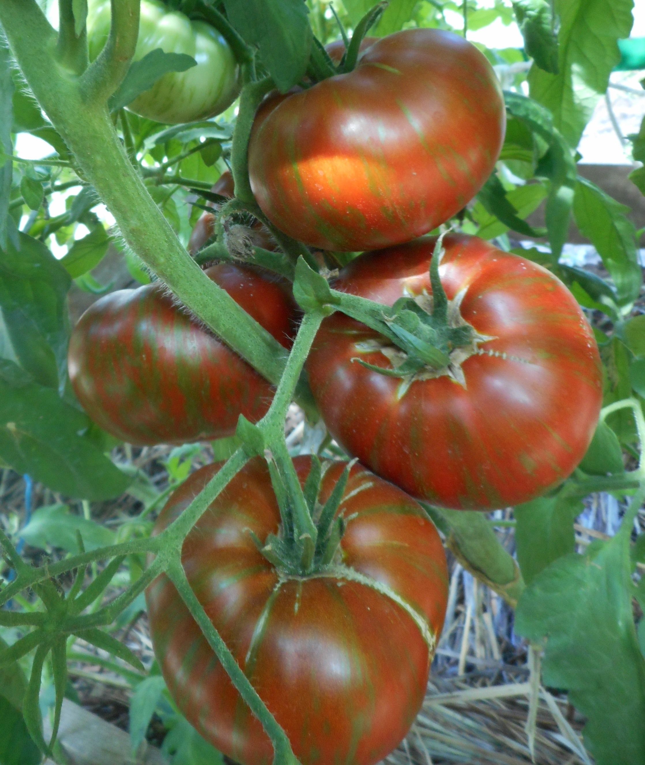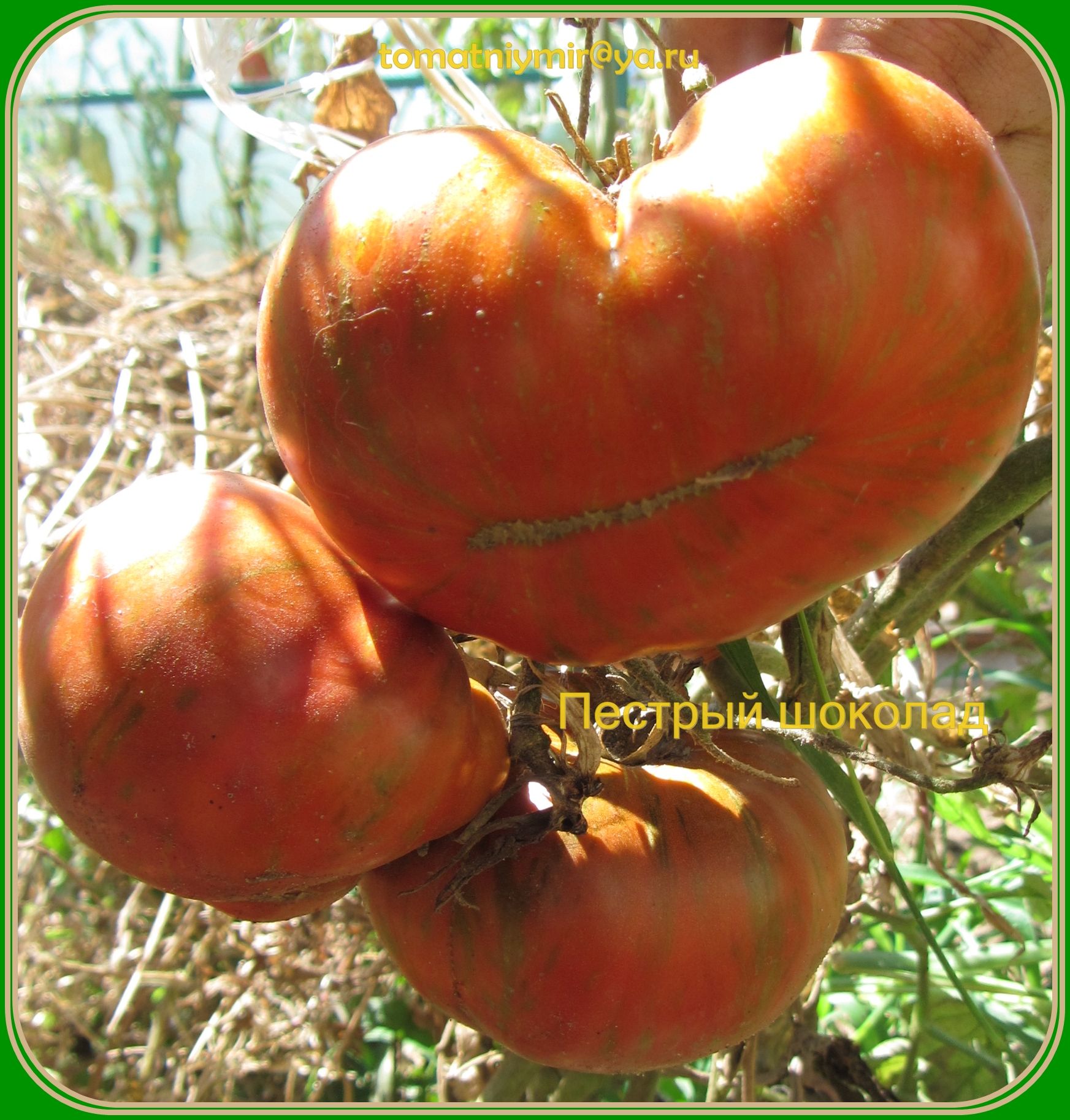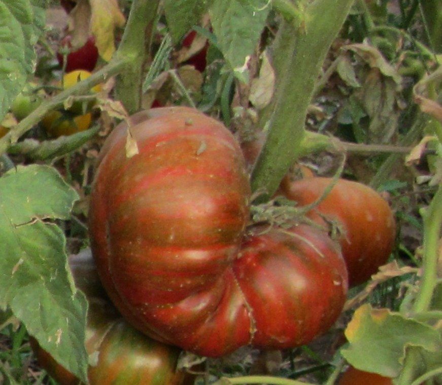 Среднеспелый, индетерминантный сорт, высота куста около 1,8м. Плоды темнобордовые с зелеными полосами, на разрезе бордовые, вес 200- 400 грамм, очень красивые и вкусные. Вкусный салатный сорт. В упаковке 10 шт. семян.