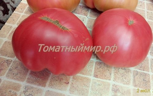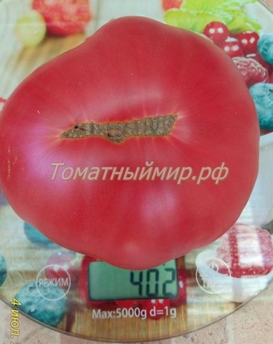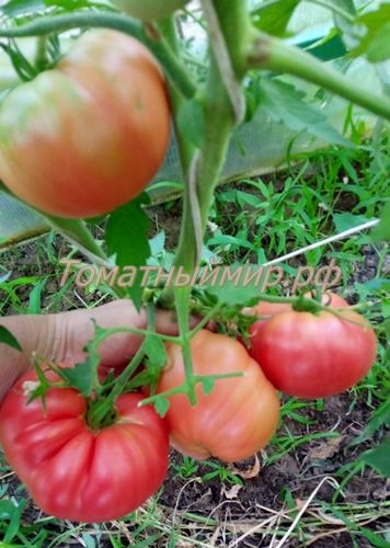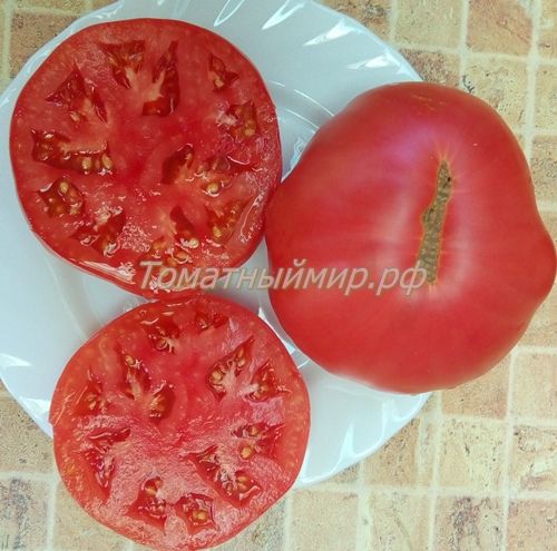 Индетерминантный, среднеспелый сорт, в ОГ высота куста до 1,5 метра, в теплице 1,8 м. Плоды плоскоокруглые, с ребристостью у плодоножки. Цвет малиново-красный, вкус насыщенный, со сладостью и кислинкой, очень вкусный томат для салатов и сока. Вес плодов 300-400 грамм. В упак. 10 шт.