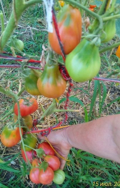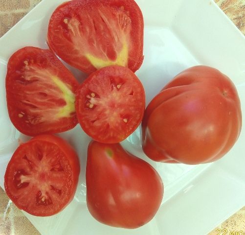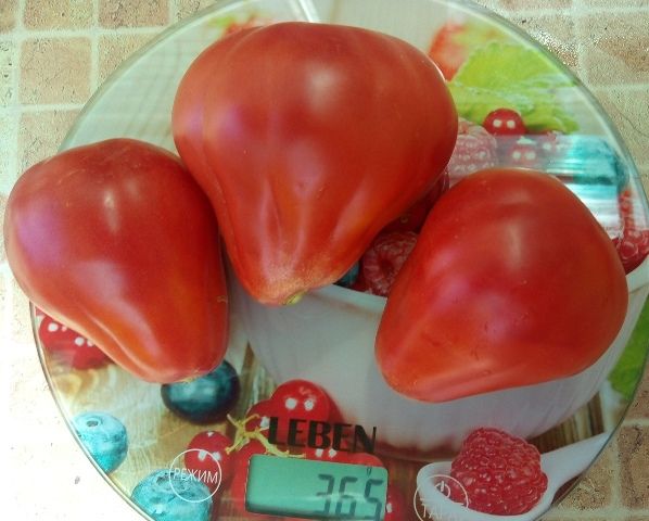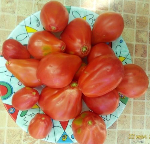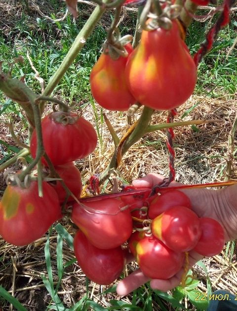 Растение прочное, в открытом грунте высотой 100-120 см, в защищенном - 150-180 см. В кисти завязывает до 7 грушевидных слаборебристых томатов малинового цвета массой 120-150 г. Плоды плотные, в меру сочные, с высокой степенью сладости. Не растрескиваются на растении, хорошо дозариваются и долго хранятся.
