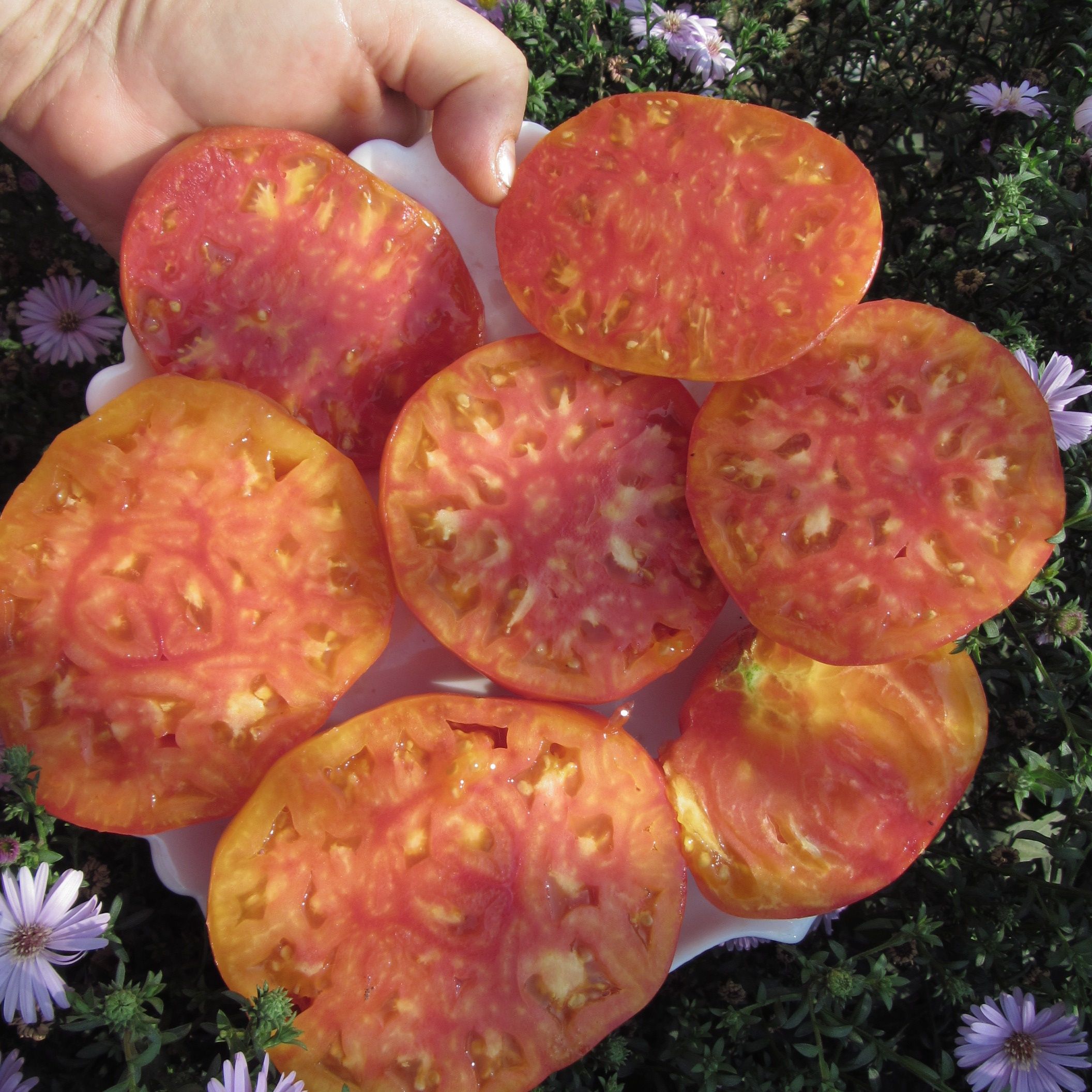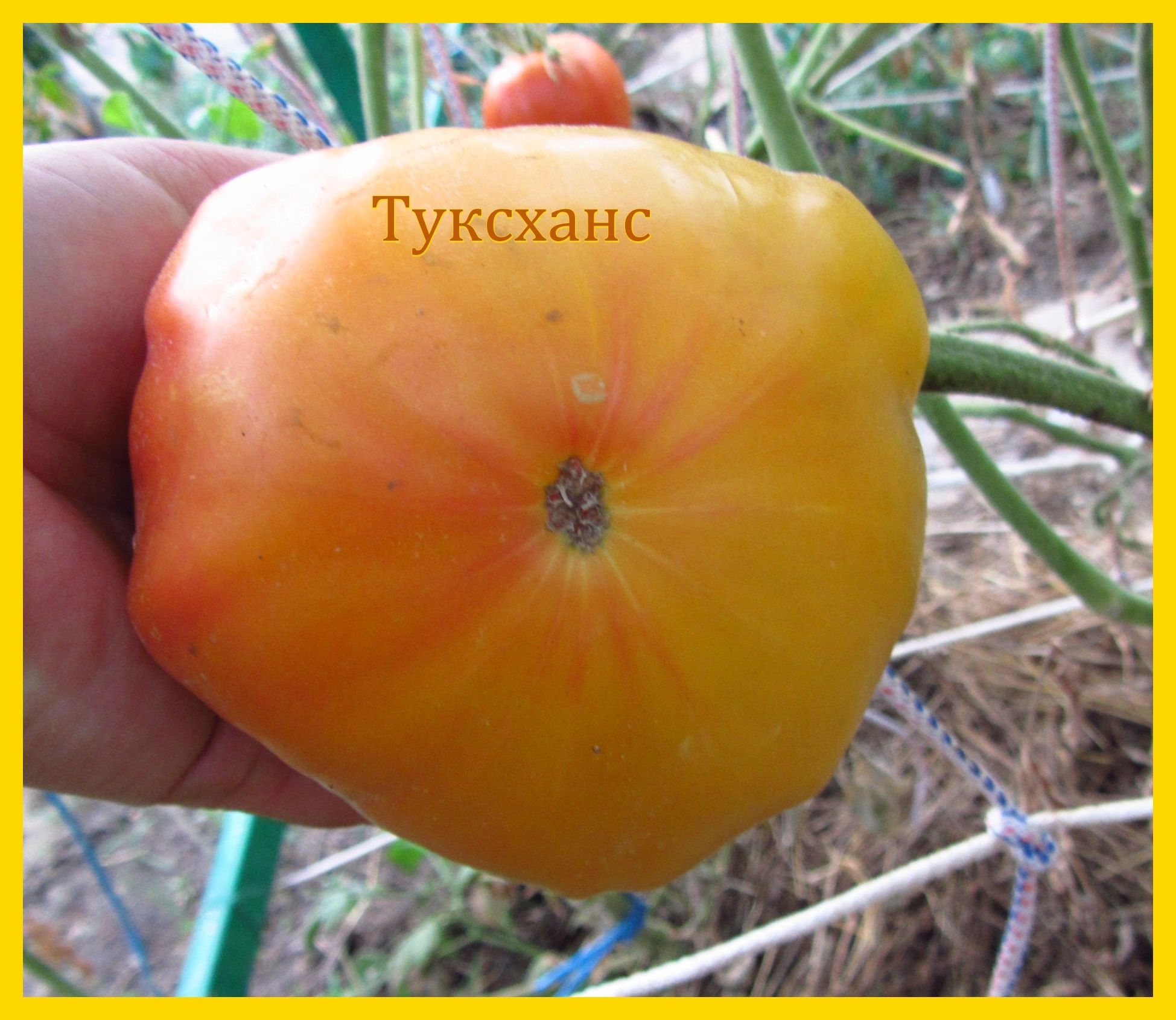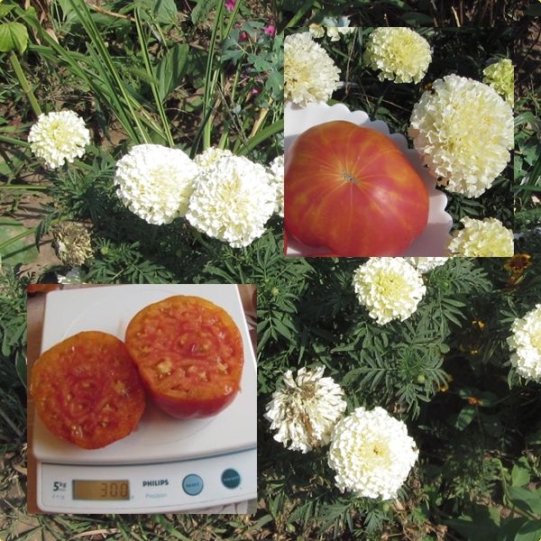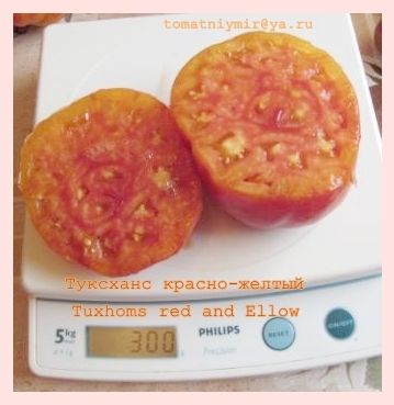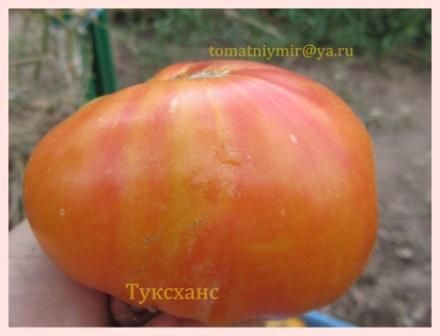Индет, среднепоздний. Плоды плоскоокруглые, жёлтые с красными пятнами, сладкие, мясистые, очень красивые на разрезе. Вкусный салатный сорт. Вес плодов 300-400 грамм. В упак. 8 штук.