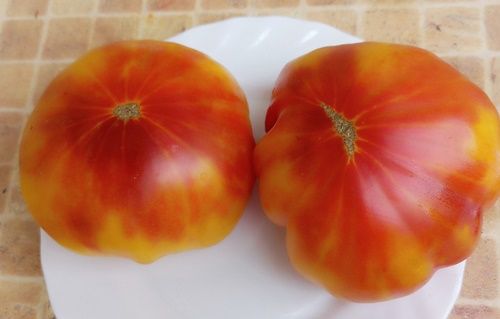 Индетерминантный, среднеспелый, высота куста в теплице 1,8 м, в ОГ около 1,5 м. Плоды плоскоокруглые, бифштексы, биколоры, оранжевые с красными пятнами, вес 200- 400 грамм. Вкус сладкий, сочный, с фруктовым послевкусием. В упак. 10 шт.