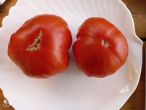 Индетерминантный, высота куста в теплице 1,7 метра, среднеспелый сорт томата. Плоды плоскоокруглые, слегка ребристые у основания, насыщенного красного цвета, крупные, мясистые. Вес 300-500 грамм, отдельные плоды крупнее. Салатный сорт. В упак. 10 шт.