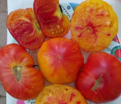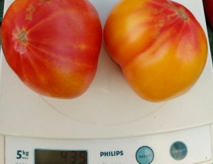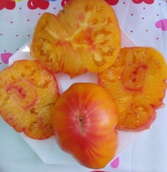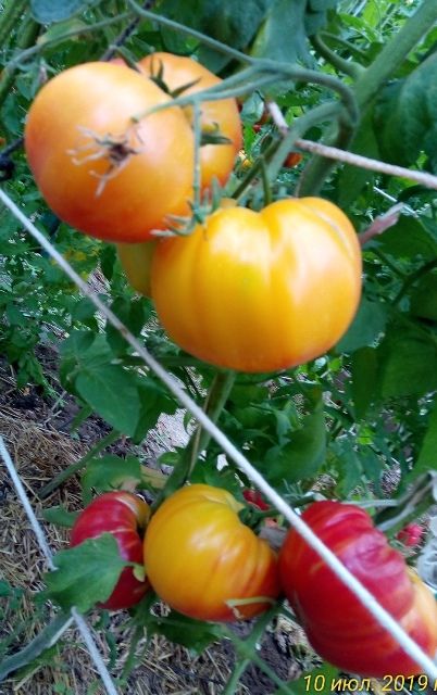 Индетерминантный, среднеспелый. Плоды биколоры, красные с желтым, плоскоокруглые, с немного приподнятой верхушкой, сладкие, мясистые, с фруктовым вкусом. Вес 200-400 грамм. В упак. 10 шт.