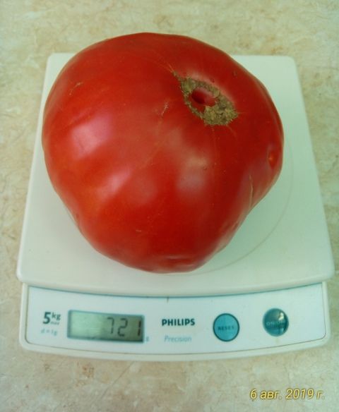 Высокорослый, среднеспелый, очень урожайный сорт с длительным периодом плодоношения. Плоды крупные, ярко-красные, бифштексного типа, очень приятного вкуса, мясистые, вкусные. Вес 400-800 грамм, при нормировке плоды могут быть крупнее. Салатный сорт и для переработки на сок, соусы, пасту. В упак. 10 шт.