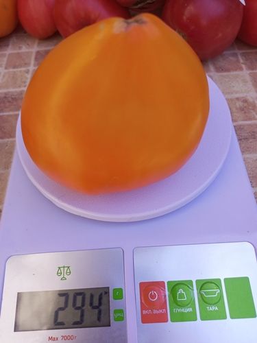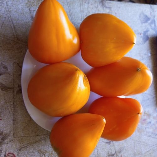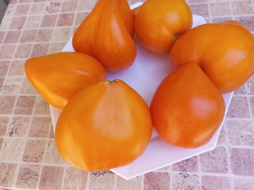 Среднеспелый, высокорослый, в ОГ был около 2 м. Плоды желто-оранжевые сердцевидные. Мякоть вкусная, сладкая, плотная, почти без сока. Вес 150-300 гр. В упак. 10 шт.