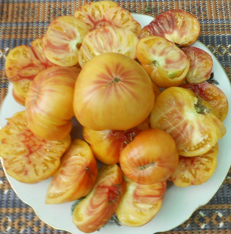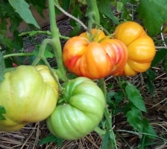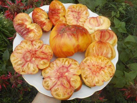 Плод крупный, жёлто-красный, тип биштекса, с фруктовым вкусом, высоким содержанием сахара, вкус восхитительный. Цвет помидора жёлтый к светло-оранжевому, с верхушки появляется красное пятно, которое постепенно увеличивается, превращается в полосы. Растения высотой до 2-х м, раскидистое, мощное. Вес плодов до 600 гр. Среднеспелый, до 100 дней.( у меня был среднепоздним)