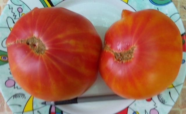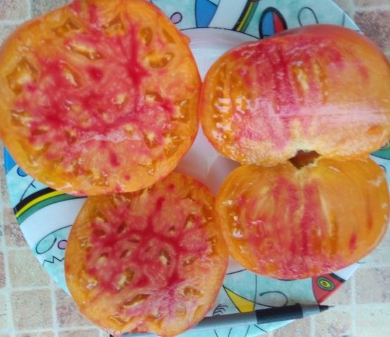 Индет, высокорослый, среднеспелый, урожайный. Плоды округлые крупные биколоры, красно-желто-оранжевые, на разрезе двухцветные, красные с желтым, вес 300-800 грамм. Сладкие, с фруктовым вкусом. Салатный сорт. В упак. 10 шт.