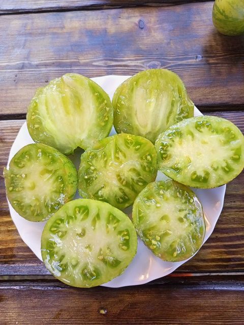Зеленоплодный сорт с антоцианом, среднеранний, высокорослый. Плоды сердцевидные, зеленого цвета с золотистыми и темно-зелеными полосками, с антоциановой шапочкой, на разрезе светло-зеленые, вес 100-250 грамм. Мякоть мармеладная, вкус насыщенный, сладкий, с фруктовыми нотками. Очень вкусный салатный сорт. В упак. 10 шт.